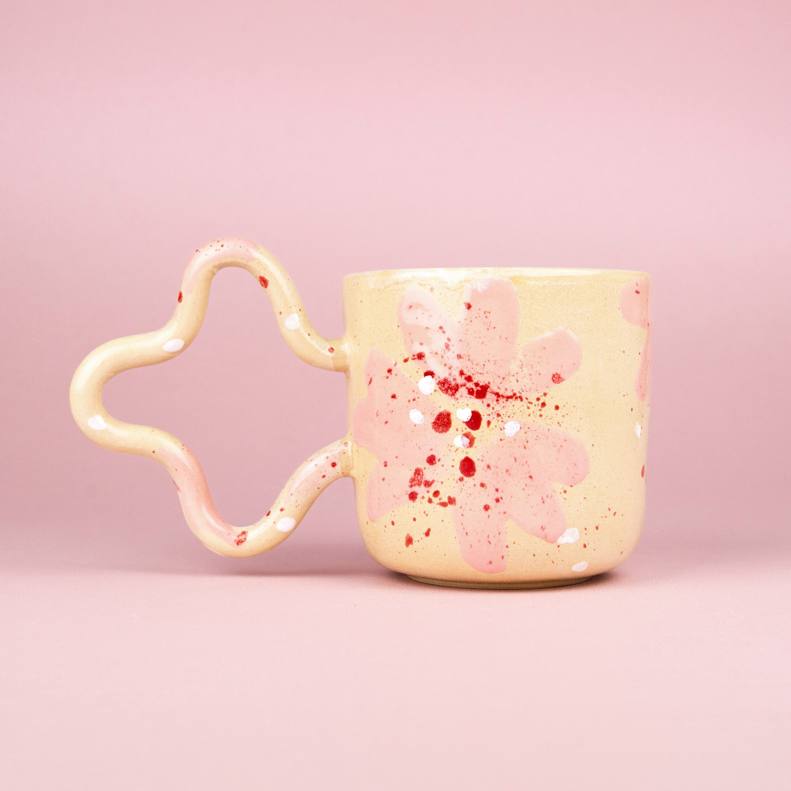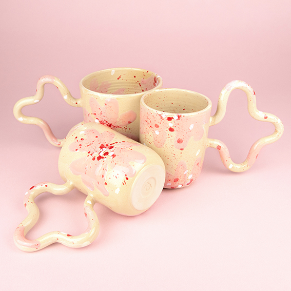 Każdy egzemplarz to unikat – wykonany z miłością do detalu i pasją do ceramiki. Delikatne, kremowe tło kontrastuje z różowymi i czerwonymi rozbryzgami farby, tworząc dynamiczny, energetyczny efekt, który przyciąga wzrok. Charakterystyczne, faliste ucho dodaje mu nie tylko funkcjonalności, ale i rzeźbiarskiego uroku.