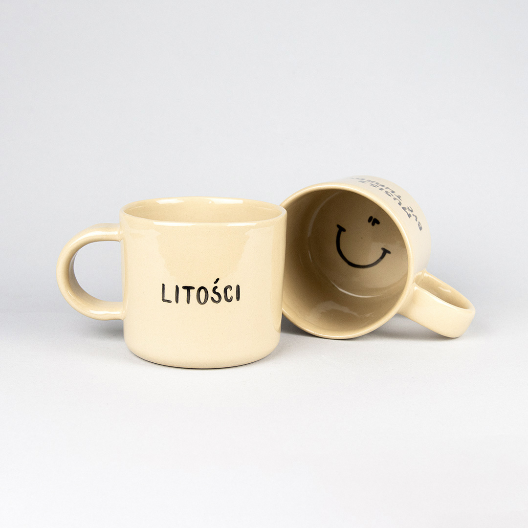 Z przodu znajduje się wyrazisty, czarny napis LITOŚCI, który przyciąga wzrok i dodaje charakteru. A co najlepsze – w środku kubka czeka na Ciebie uśmiechnięta buźka, która umili każdy łyk i wywoła uśmiech na Twojej twarzy.